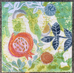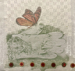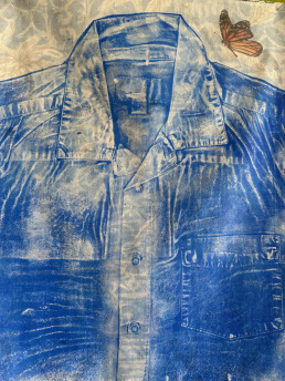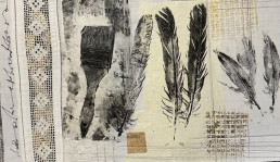 Using a gel plate to produce these mono-prints allows me to capture elusive details of everyday objects that often go unnoticed – and speak to the history of the object being printed. Who wore those gloves or that outrageous blouse? Where did the feathers come from? How many times has that brush been dipped into the paint pot? The nuances of our lives are often in the details. I invite you to slow down and look for the stories the pieces are telling.