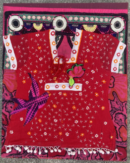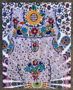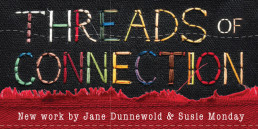 Using children’s clothing in these art quilts was a serendipitous choice that plays well with Jane’s gel printed pieces. I made these pieces with the thought that for all we claim to treasure children, our world offers threats to their wellbeing both in increasingly frequent natural disasters and increasingly violent human behaviors. Just looking at numbers of children who die or are injured from school shootings, is appalling. Since 2000, the number of school shooting fatalities and injuries has skyrocketed — in 2000 there were 6 school shootings. In 2024 there were 56. These pieces of children’s clothing are loving memorials to those who died since 2000: 462, including the shooters who were often children as well. Twenty-five more children have died in school shootings in 2025. (https://en.wikipedia.org/wiki/List_of_school_shootings_in_the_United_States_(2000%E2%80%93present)